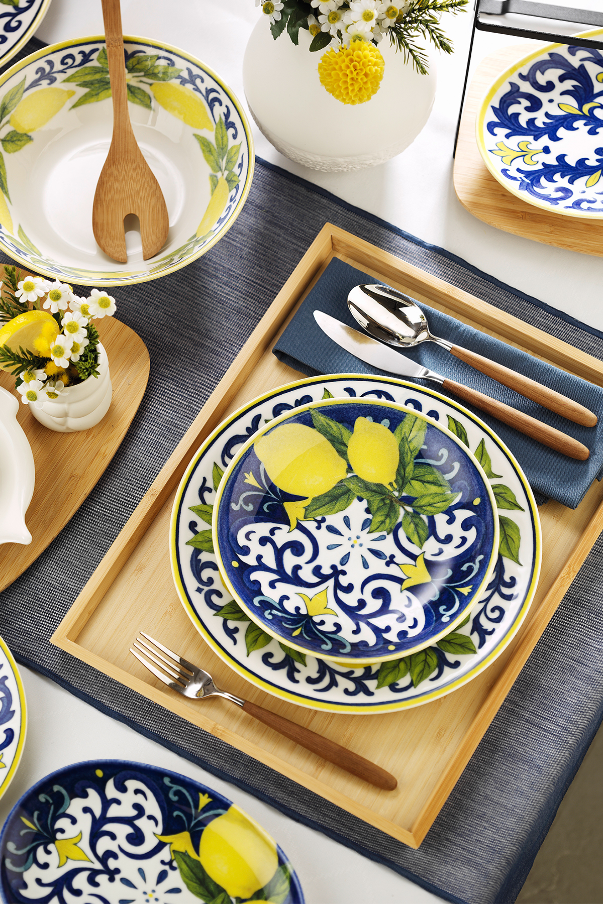 Sabahın ilk ışıkları Akdeniz'in engin maviliklerine dokunur. Gökyüzünün turuncudan sarıya, maviden altına uzanan renkleri, sofralara taşınır. Aurora koleksiyonu, limonun canlı sarısıyla gün doğumunun enerjisini, mavi desenlerle ise denizin huzurunu bir araya getirir.