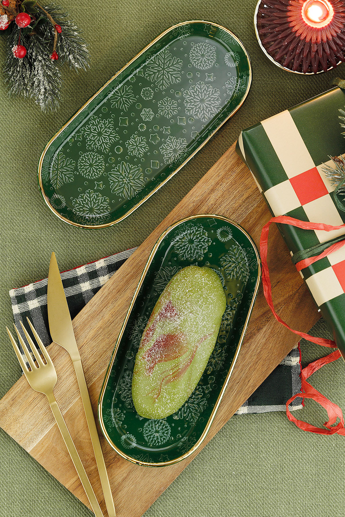 | Yılbaşı koleksiyonumuz Holyday Holyday’in renk paleti klasik yılbaşı ruhunu çağırırken modern bir sakinlik taşıyor: Derin Yeşil: Çam ağaçlarının huzuru; doğayı ve sürekliliği simgeliyor. Kırmızı: Kutlamanın kalbi; sıcaklık, canlılık ve neşeyi sofraya taşıyor. Altın İnce Çerçeve: Işığın sofradaki karşılığı. Sade formlara zarif bir “özel gün” dokunuşu ekliyor. Bu üçlü, hem nostaljik hem çağdaş bir tat yaratıyor: “her yıl aynı heyecanla kurulan ama her seferinde yeni anılarla dolan” sofralar gibi. |