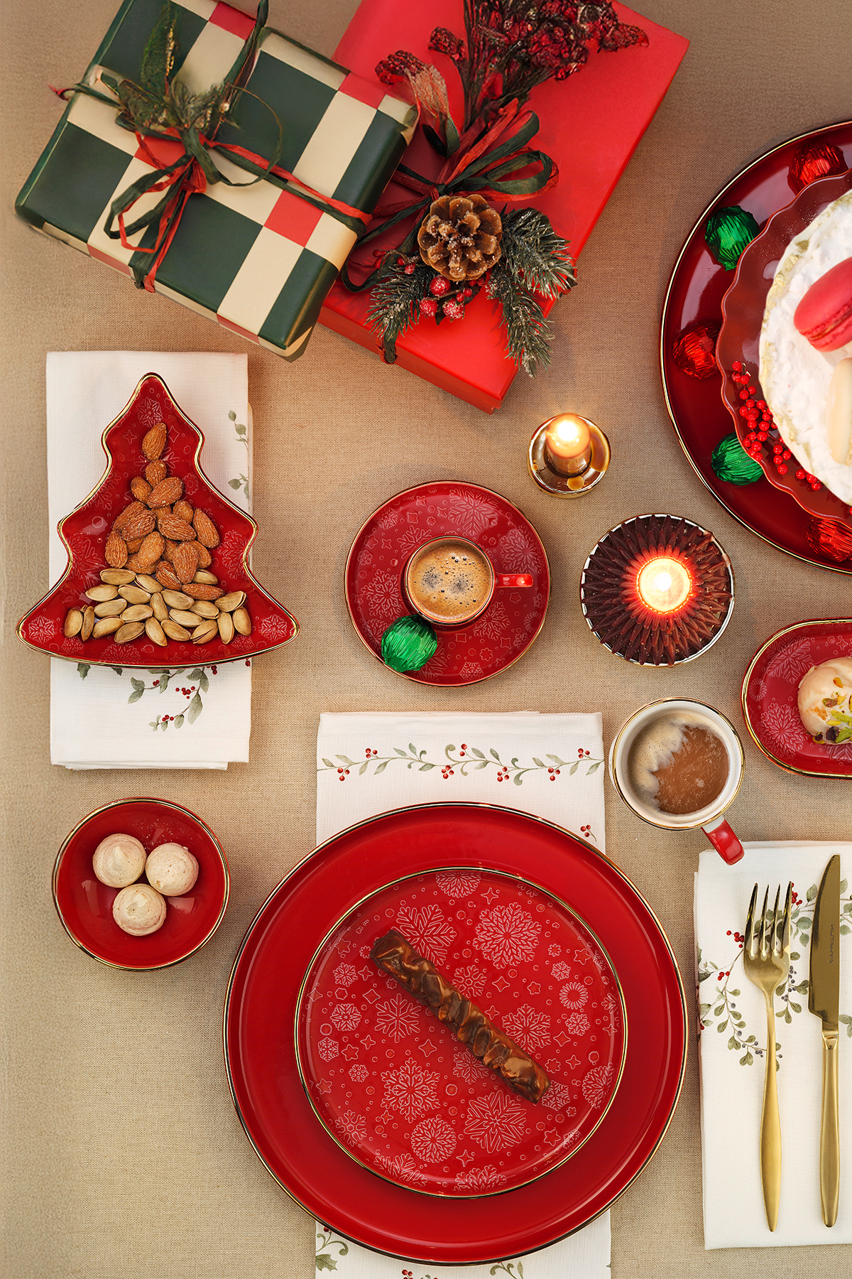 | Yılbaşı koleksiyonumuz Holyday Holyday’in renk paleti klasik yılbaşı ruhunu çağırırken modern bir sakinlik taşıyor: Derin Yeşil: Çam ağaçlarının huzuru; doğayı ve sürekliliği simgeliyor. Kırmızı: Kutlamanın kalbi; sıcaklık, canlılık ve neşeyi sofraya taşıyor. Altın İnce Çerçeve: Işığın sofradaki karşılığı. Sade formlara zarif bir “özel gün” dokunuşu ekliyor. Bu üçlü, hem nostaljik hem çağdaş bir tat yaratıyor: “her yıl aynı heyecanla kurulan ama her seferinde yeni anılarla dolan” sofralar gibi. |