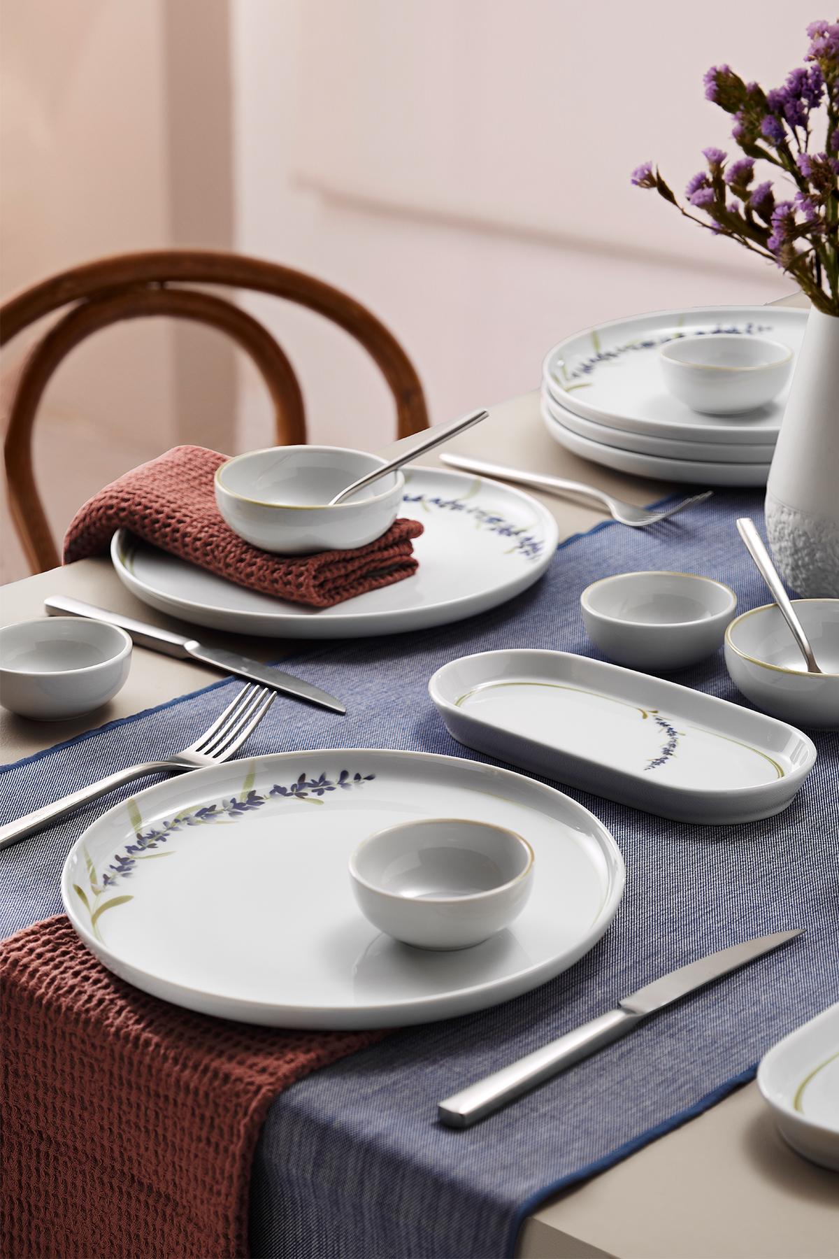 Yuvarlak formun zarif akışı, sonsuzluğu ve bütünlüğü simgelerken, köşeden usulca süzülen lavanta dalları sofraya romantik bir dokunuş katar.