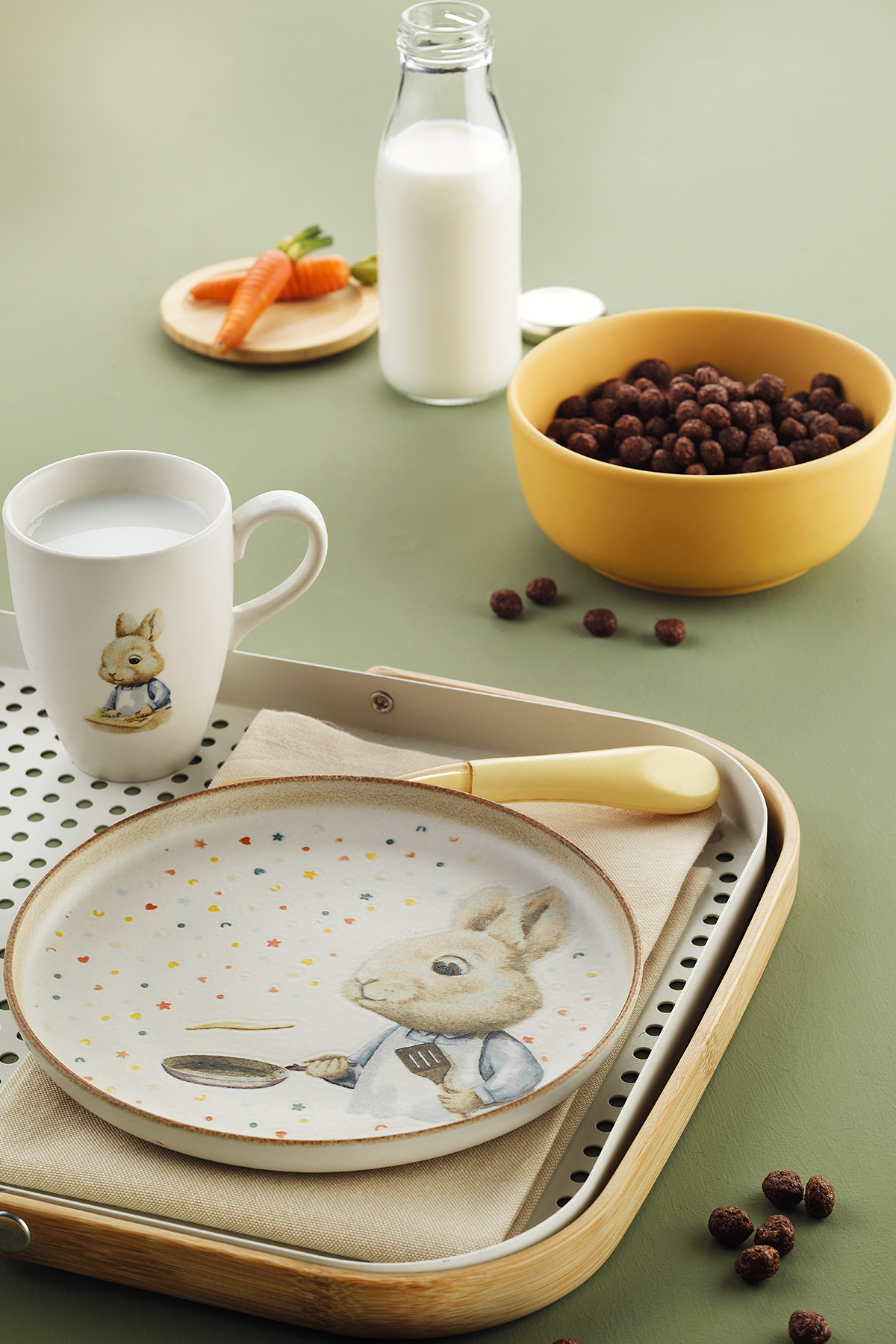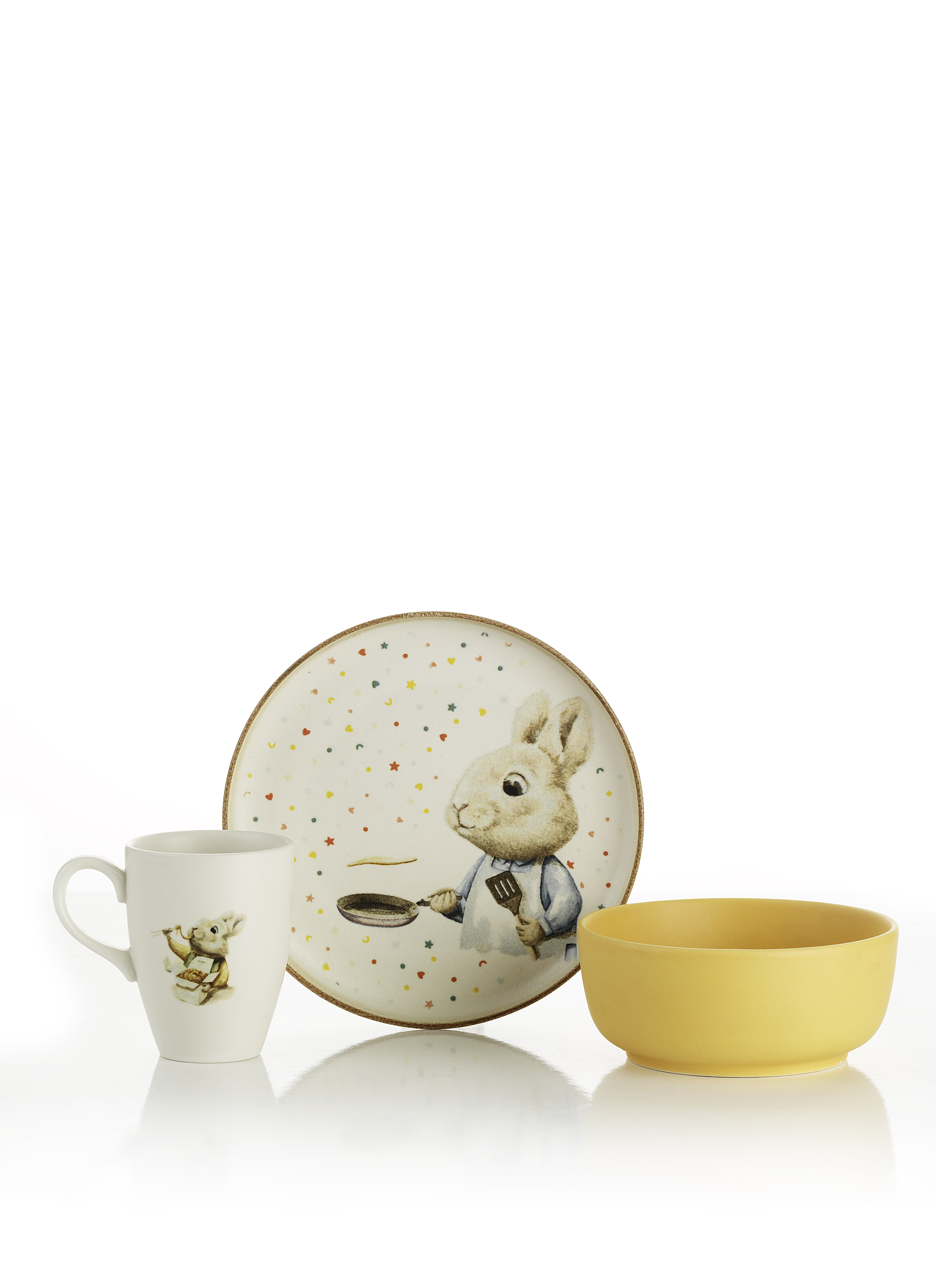 Tabakların üzerindeki minik yıldızlar, kalpler ve renkli noktalar; tavşanın mutfağındaki neşeyi ve çocuk dünyasının masum enerjisini temsil ediyor. Yumuşak pastel tonlar ve sulu boya etkili illüstrasyonlar, porselen yüzeyle uyum sağlayarak sakin, güvenli ve sıcak bir atmosfer yaratıyor.