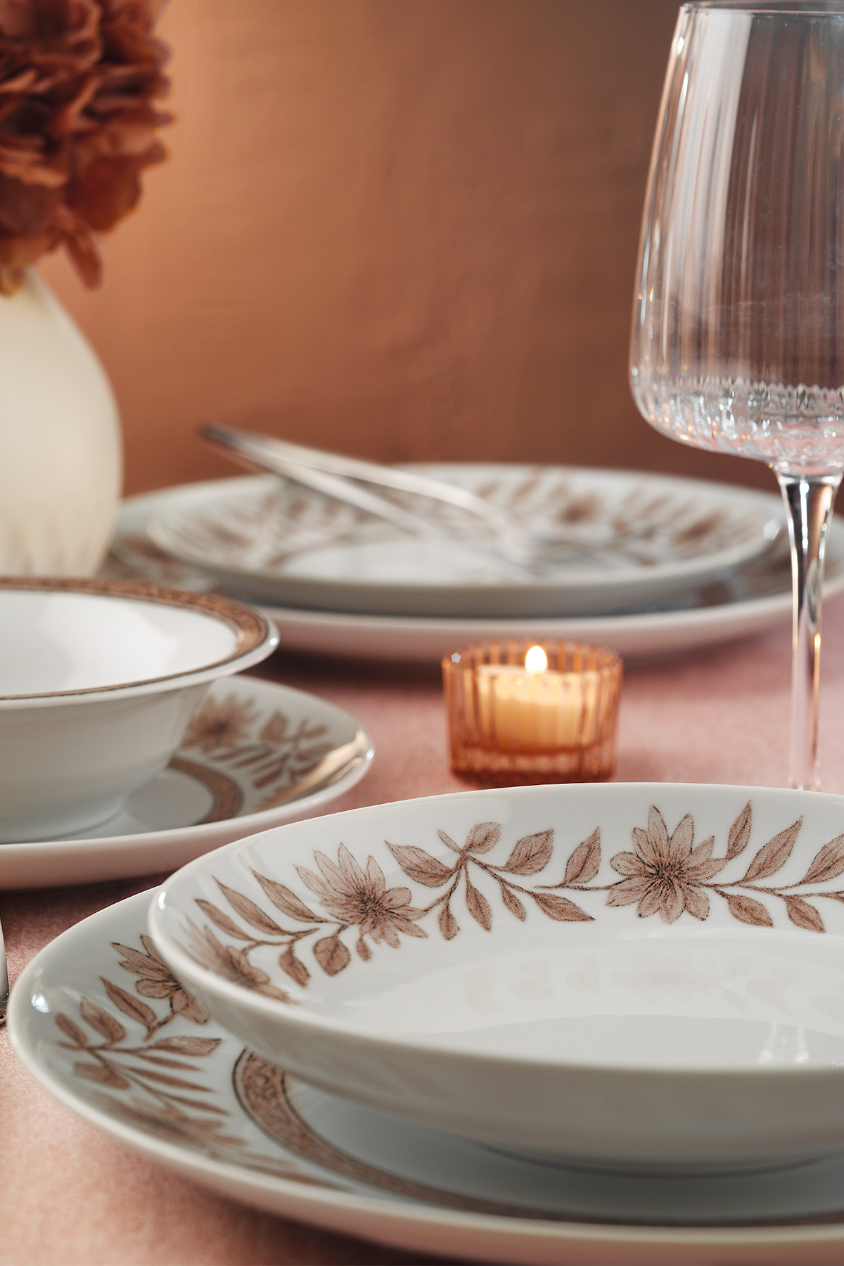 ''Meadow Maroon' Doğanın sıcak tonlarından ilham alarak tasarlandı. Kır çayırlarının sakin akışını yansıtan yaprak ve çiçek motifleri, bordo tonunun derinliğiyle birleşerek sofralara zarif bir doğallık getirir.Modern çizgisiyle zamansız bir şıklık sunan koleksiyon , hem günlük kullanımda hem de özel anlarda estetik bir atmosfer yaratmak için tasarlandı.
