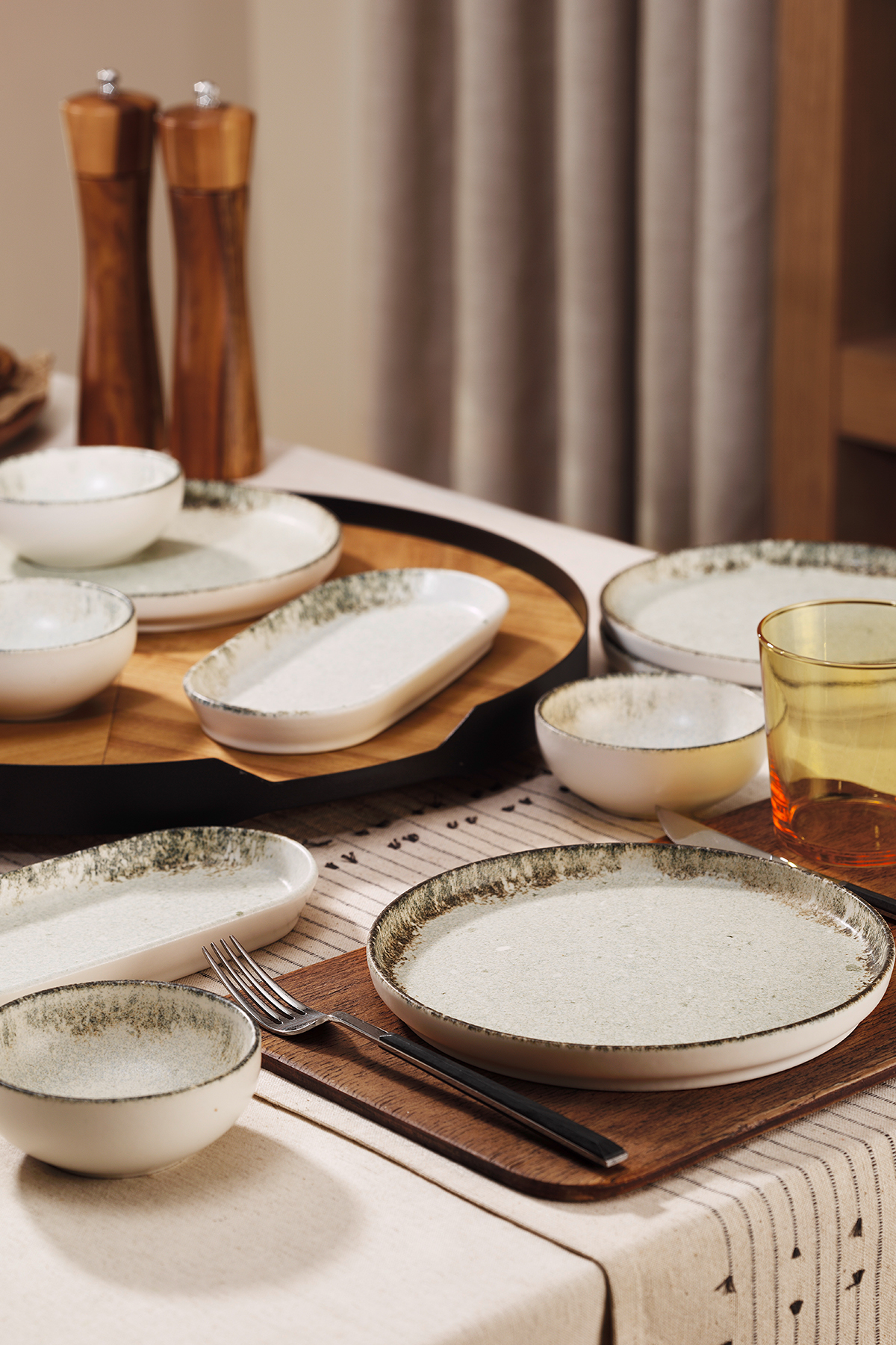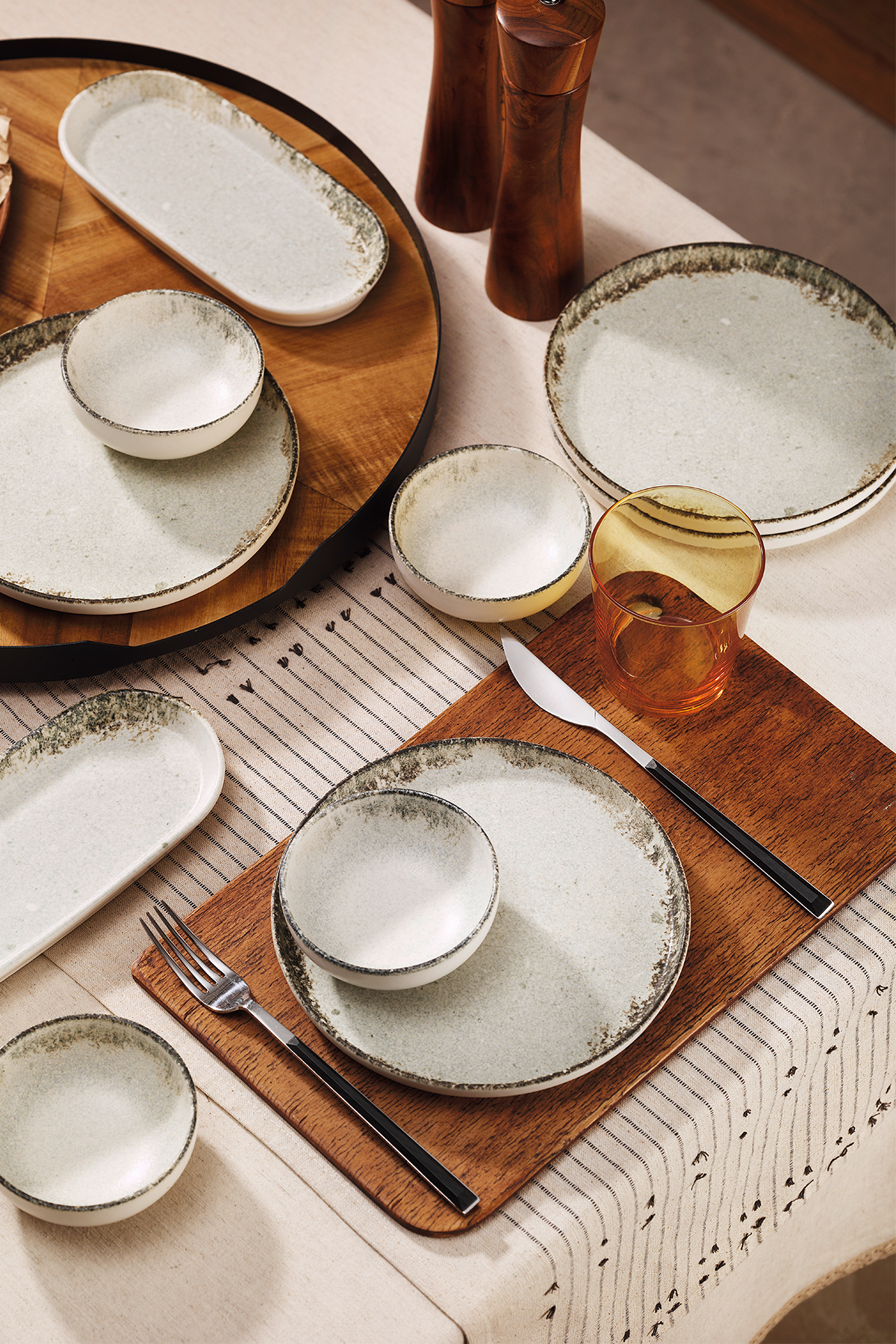 metalik dokunuşlarla birleştirerek zamana meydan okuyan sofistike estetik sunuyor. Toprak tonlarının mistik geçişlerini yansıtan zarif kenar detayları ve mat dokusu, her sunuma sade ama çarpıcı bir saflık katıyor.